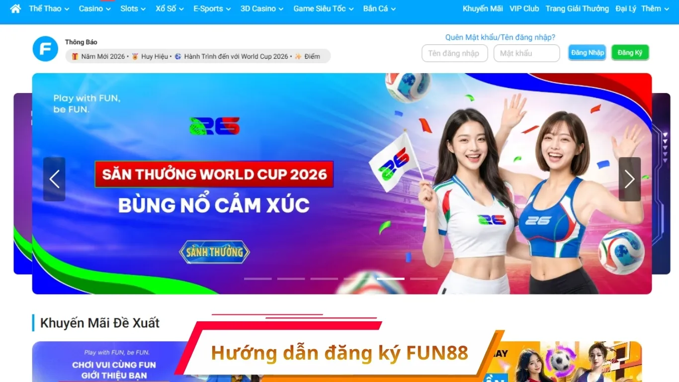 Tại giao diện trang chủ FUN88, bạn quan sát góc trên bên phải màn hình, sau đó nhấn vào nút “Đăng Ký” để bắt đầu tạo tài khoản mới.